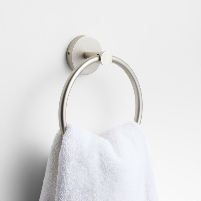 Sometimes it's the small things that pull a room together. That's why we've designed a hardware collection with modern silhouettes, clean lines and a touch of tradition to give your bathroom that perfect finishing touch. Made of brass with a brushed nickel finish, the stylish hand towel ring threads a perfect circle through a tapered cylindrical rod grounded by a scaled-up round rosette base. The result is a functional towel rack with a graphic look and modern proportions for an instant bathroom refresh. The towel ring is ready to mount on the wall with included hardware.