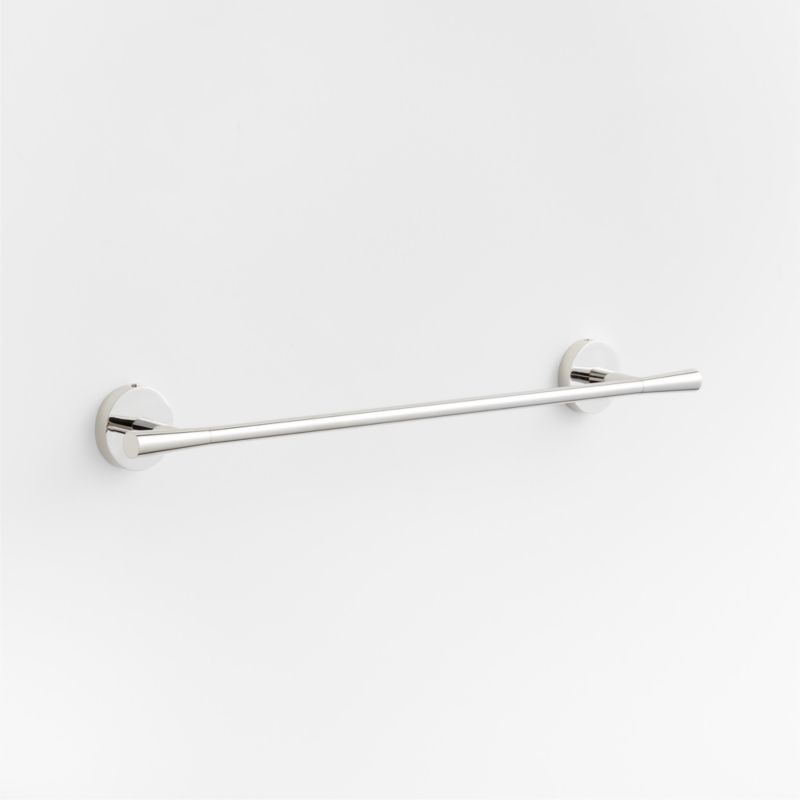 Sometimes it's the small things that pull a room together. That's why we've designed a hardware collection with modern silhouettes, clean lines and a touch of tradition to give your bathroom that perfect finishing touch. Made of brass with a shiny chrome finish, the stylish towel bar caps the hanging rod with subtly tapered finials. Cylindrical posts anchored with scaled-up round rosette bases provide a graphic look with modern proportions. Also available in a longer length, the 18-inch towel bar is ready to be wall mounted with included hardware.