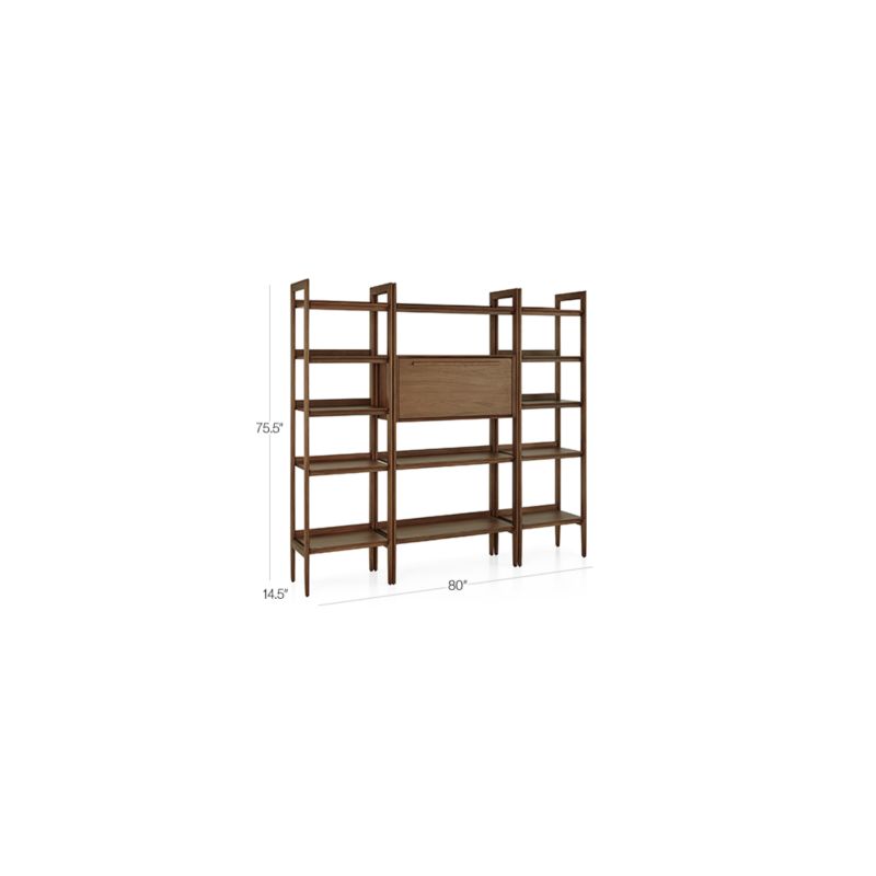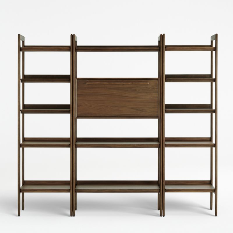 Our popular Tate collection brings its cool, 1960s vibe into the office, family room or library as a modular storage solution with style to spare. Flanked by bookcases that give rise to clean-lined shelves, the bookcase bar features a flat-front door that drops down to reveal a rack for wine glasses, glass shelf, handsome mirrored back and plenty of space to store wine bottles and barware. A seamless mix of open and closed storage, this bookcase configuration showcases the beautiful walnut veneer. Designed by Blake Tovin, the Tate Bookcase Bar with 2 Bookshelves is a Crate and Barrel exclusive.