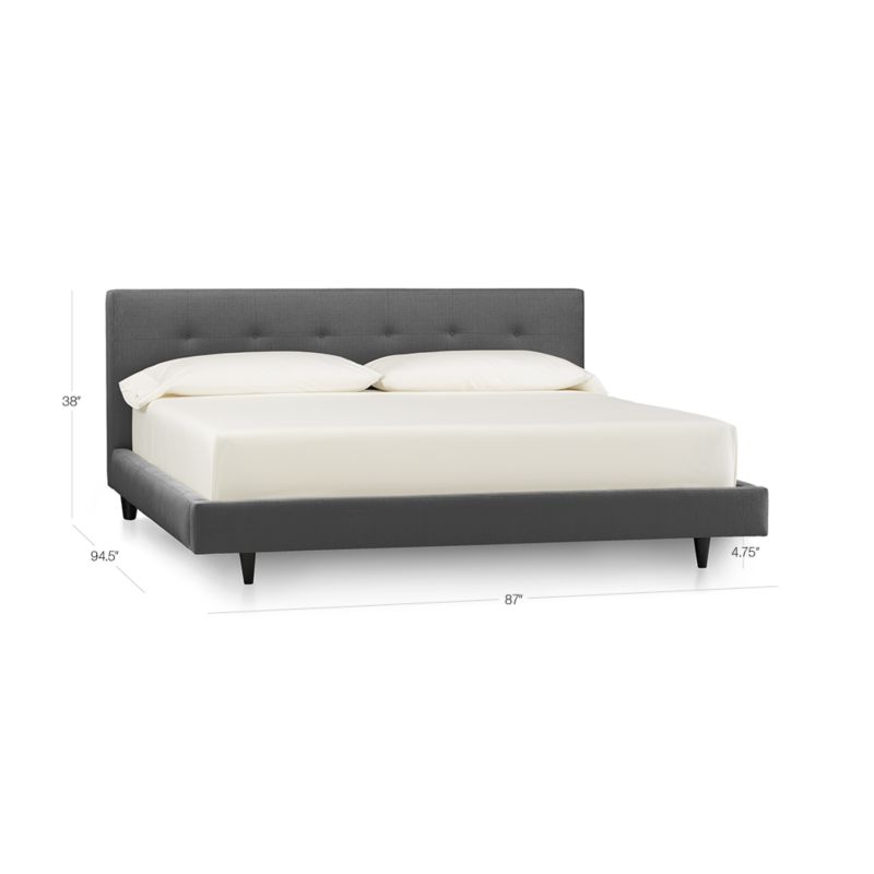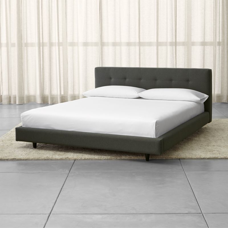Streamlined platform bed features inset legs finished in dark brown for a floating effect. The Tate Charcoal California King Bed is a Crate and Barrel exclusive.