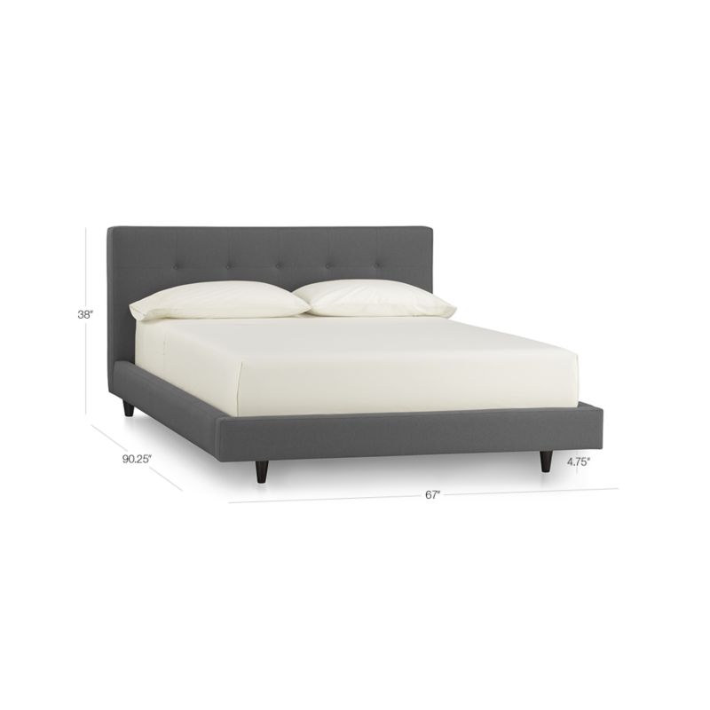 Streamlined, low platform bed sits on inset legs finished in dark brown to create a floating effect. The Tate Charcoal Queen Bed is a Crate and Barrel exclusive.