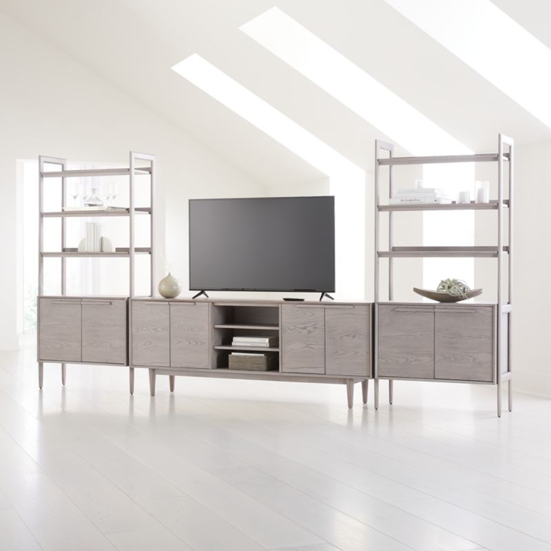 The bookcases feature cabinets with sleek flat-front doors and linear undercut pulls that showcase Tate's beautiful ash veneer finished in stone. Designed by Blake Tovin of Tovin Design, the Tate Stone 80" Media Console with 2 Bookcase Cabinets is a Crate and Barrel exclusive.