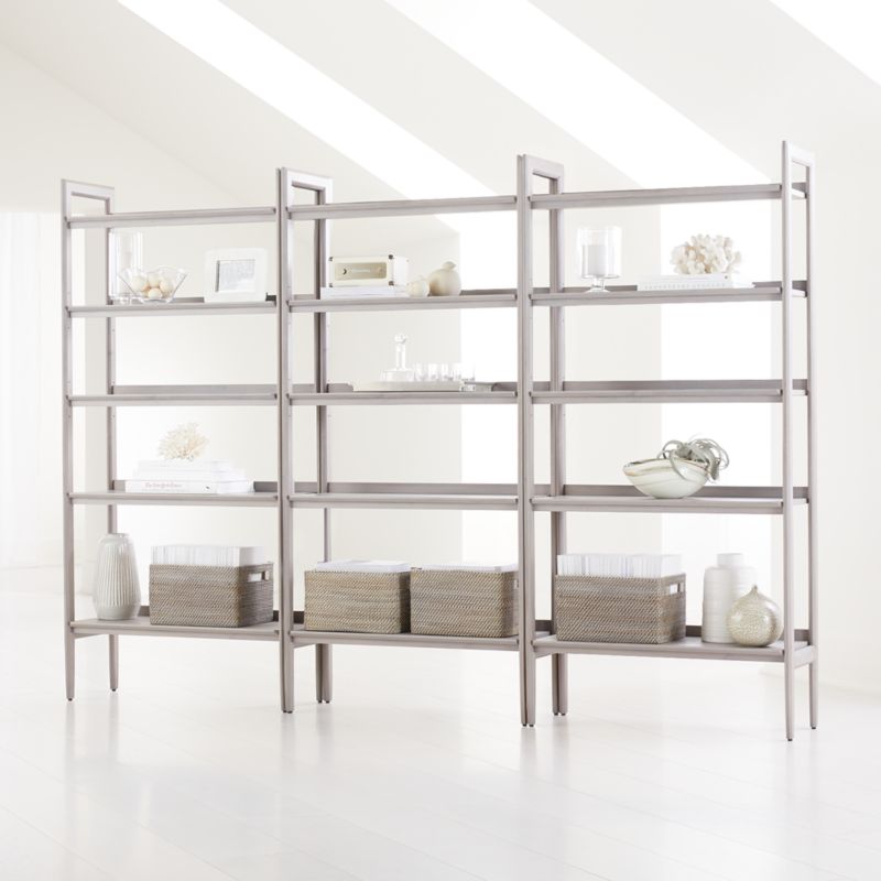 Our popular Tate collection brings its cool, 1960s vibe into the office, library or living room as a modular storage solution with style to spare. This trio of wide bookcases gives rise to shelves made of stone-finished ash veneer in a timeless and clean-lined design by Blake Tovin of Tovin Design, a Crate and Barrel exclusive.
