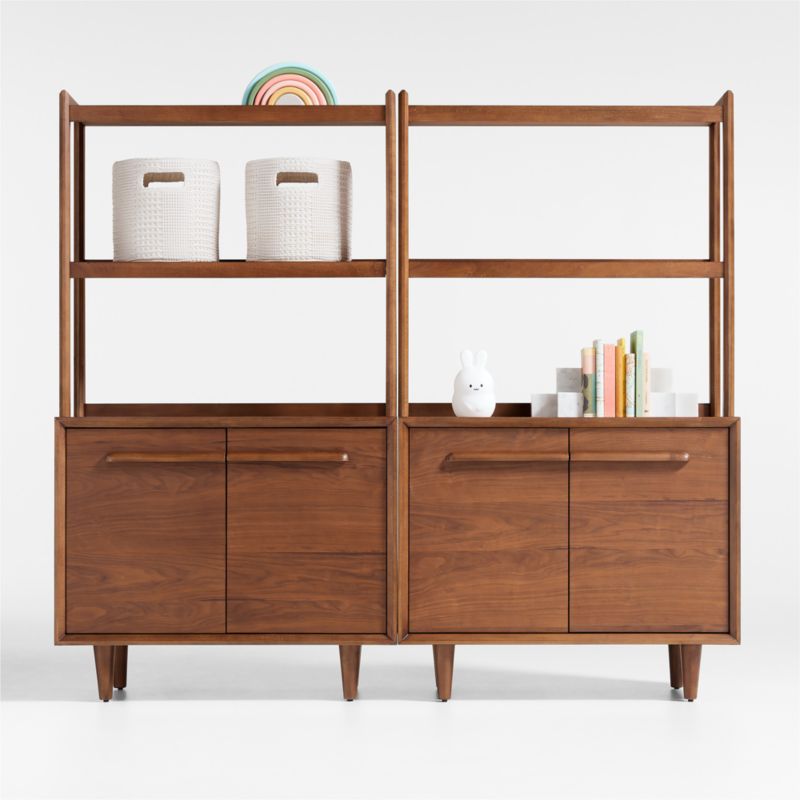 Tatum Set of 2 Modular Walnut Wood 2-Door Kids Storage Bookcases with Hutches