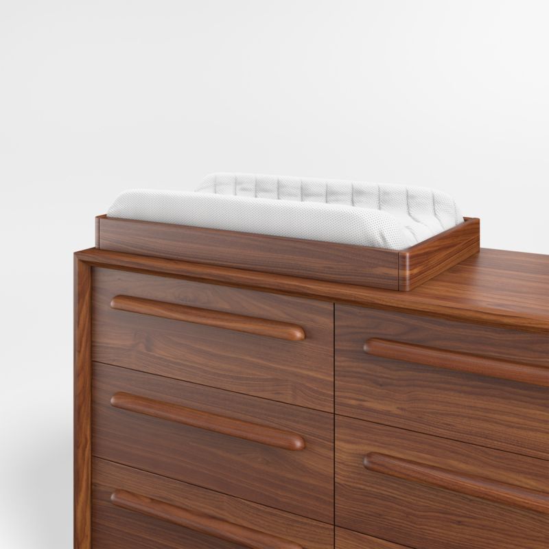Turn our Tatum Mid-Century Wide Dresser into a stylish mid-century-inspired changing table for your nursery. Expertly crafted in solid poplar and walnut veneer, it features a natural walnut finish to highlight the gorgeous grain pattern.