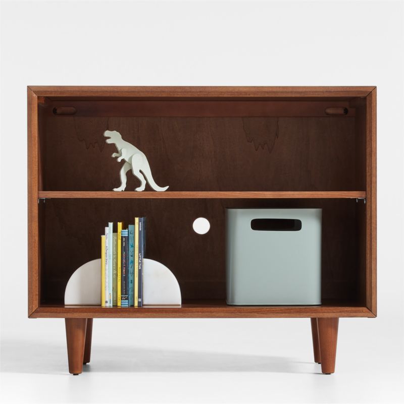 Meet Tatum. Crate & Kids' quintessential mid-century furniture collection for today's modern family. Tailored lines and tapered legs are expertly crafted in solid poplar and walnut veneer with a natural walnut finish to highlight the gorgeous grain pattern. The 2-shelf bookcase provides open display of books, collectibles, toys and more. Create a timeless design with coordinating pieces from our Tatum collection.