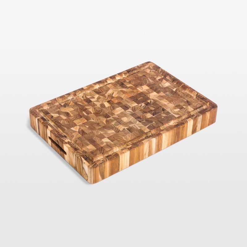 A checkerboard of gorgeous end-grain teak shapes this stunning, durable and versatile cutting board. Thick and sturdy yet gentle on knives, the butcher block-style board stands up to chopping vegetables, carving meat and slicing bread. A grooved border on one side collects crumbs or juices, and inset grips provide a stable grip for carrying charcuterie or roasts to the table.