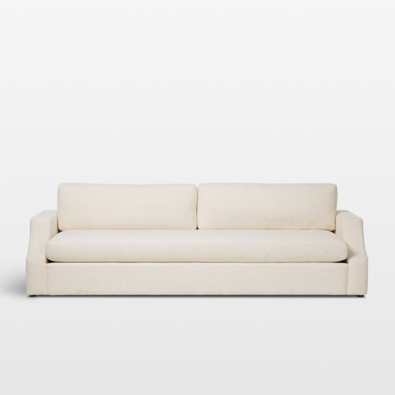 Terrace offers a deep seat for curl-up lounging along with clean, modern lines. An excellent choice for busy homes, the sofa is upholstered in an off-white linen-blend performance fabric that's specially engineered to protect against stains, moisture and odor. Scoop arms create a striking cutout effect that draws the eye to the sink-in soft bench seat and back cushions. Made with removable covers, the cushions reverse so the sofa always looks fresh and inviting.