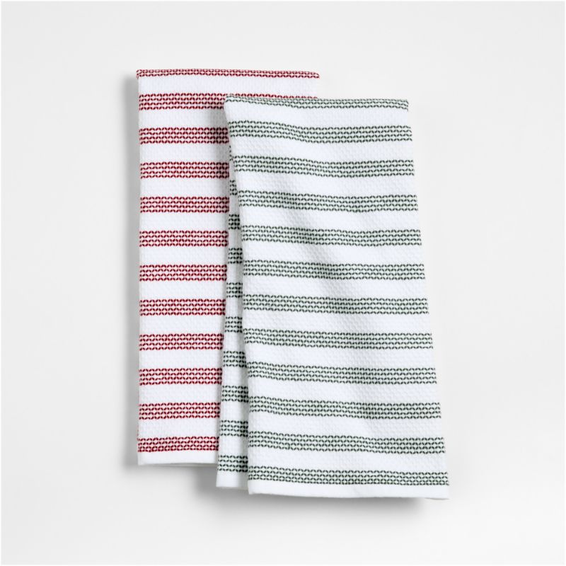 Our textured terrycloth dish towel set is woven in red and green stripes for the Christmas kitchen. The two fresh, functional and ultra-absorbent organic cotton towels reverse to solid snow-white terry. The textured, flat-weave sides dry delicate glassware to a lint-free finish, while the terrycloth sides are ideal for drying pots and pans. Crate & Barrel exclusives, our holiday textured terry dish cloths infuse the kitchen with a subtle note of festive cheer.