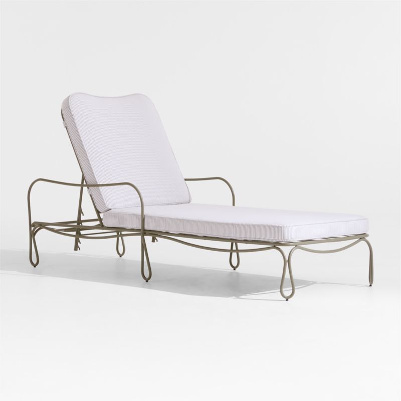 The Harpen chaise lounge loops and curves, drawing on Old Hollywood glamour and vintage whimsy for a look that feels classic yet fresh. Finished in soft sage green, the steel base flows hairpin legs, a scalloped apron, graceful armrests and a X-patterned back with central oval detail for a great view at any angle. A dove grey and off-white ticking stripe covers the box cushion in all-weather durability and understated style, trimmed with smart self-welting for a tailored touch. For the ultimate lounge, the chaise adjusts to five settings for just the right angle of repose.