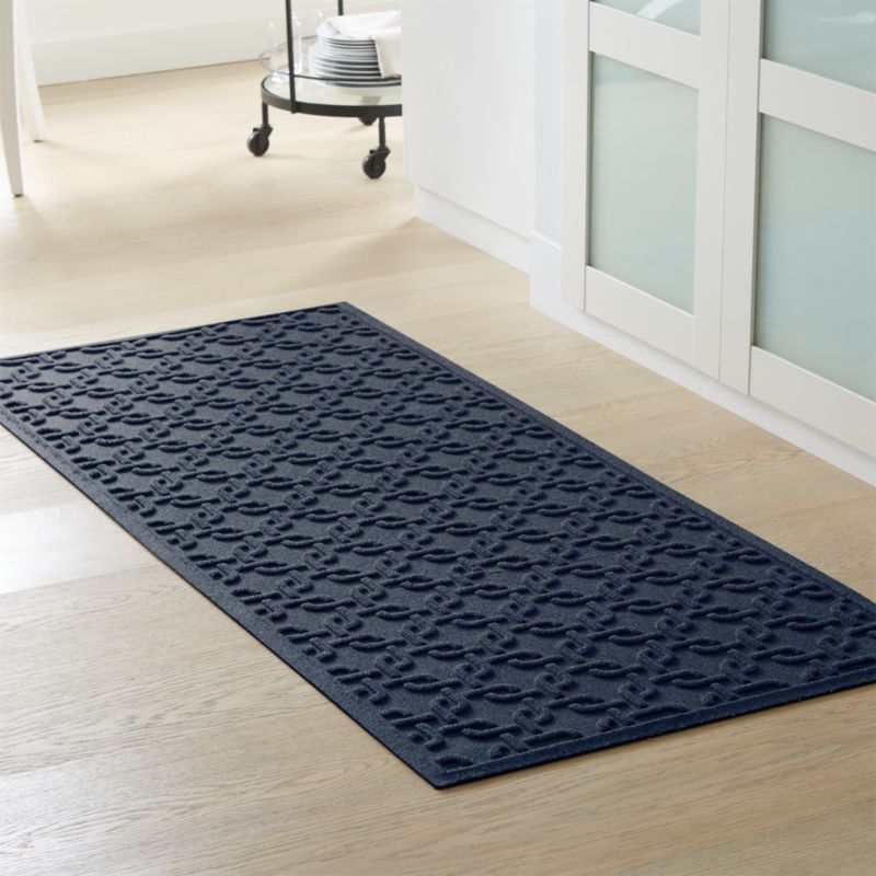 This absorbent "thirsty" mat in a great shade of blue lives up to its name, indoors or out. Unique construction wicks away moisture, trapping it in the pile for quick evaporation before floors, doorways or mudrooms get slick and dirty. Featuring a fun carved link design, this long-lasting mat is finished with secure, non-skid rubber backing, keeps a low profile under opening and closing doors, and won't fade, crack, mold or mildew.