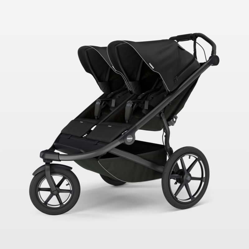 Beloved for its unmatched maneuverability and sleek, lightweight design, the Thule Urban Glide 3 side-by-side double stroller has roomy, adjustable seats and easily passes through doorways. Equipped with large 16" rear tires, it delivers a smooth, comfy ride, whether you're maneuvering curbs or boarding a crowded subway. When you're moving at a quicker pace, the swivel front wheel easily locks into place, and the twist hand brake provides optimal speed control on pavements or hilly terrain. Its one-handed, compact fold makes tucking it away a breeze wherever you are, and the spacious cargo basket with zip-top cover secures all your essentials.