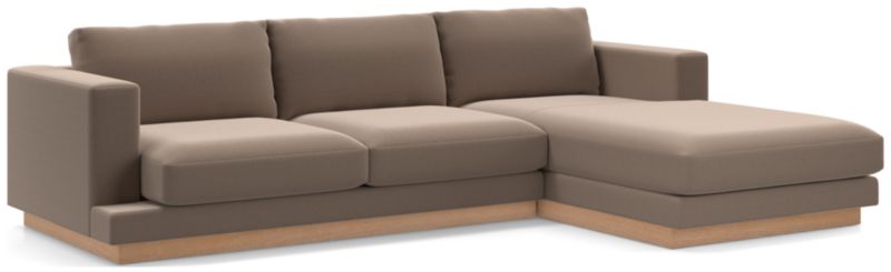 While you sink into the laid-back comfort of our Tidal sectional, enjoy the feel-good vibes of knowing that the sofa's upholstery includes yarn made from recycled ocean plastic. The durable, easy-care fabric indulges with a soft micro-chenille weave that perfectly complements the deeply cushioned seat and pillow backs that provide just the right amount of recline. Combining a right-arm chaise and left-arm sofa, the two-piece sectional features set-back arms and exposed seat decks that create a stepped look with an ash veneer plinth base that lets the sofa float in a room. Though Tidal's stocked upholstery contains a percentage of upcycled ocean plastic, it has a very soft and inviting hand that begs to be touched.