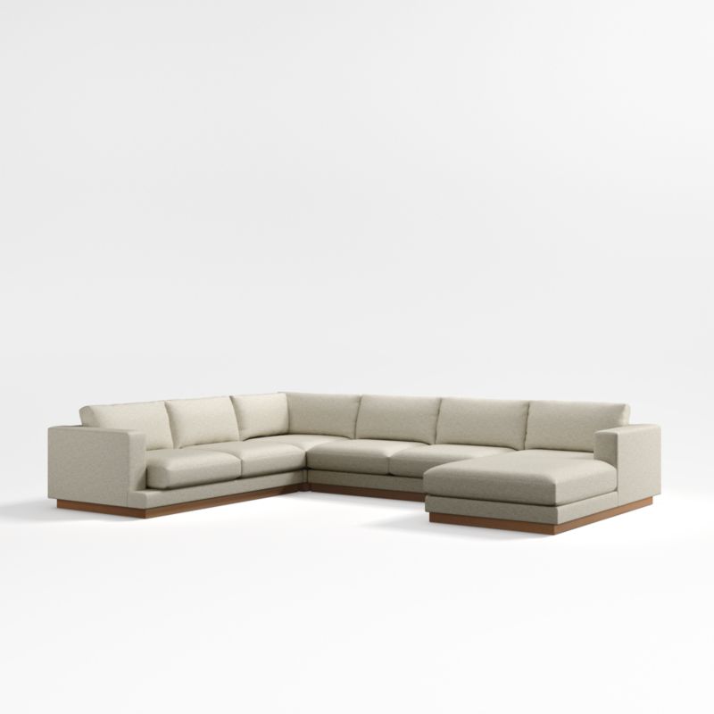 While you sink into the laid-back comfort of our Tidal sectional, enjoy the feel-good vibes of knowing that the sofa's upholstery includes yarn made from recycled ocean plastic. The durable, easy-care fabric indulges with a soft micro-chenille weave that perfectly complements the deeply cushioned seat and pillow backs that provide just the right amount of recline. Combining a right-arm chaise, armless sofa, corner and left-arm sofa, the L-shaped sectional features set-back arms and exposed seat decks that create a stepped look with an ash veneer plinth base that lets the sofa float in a room. Though Tidal's stocked upholstery contains a percentage of upcycled ocean plastic, it has a very soft and inviting hand that begs to be touched.