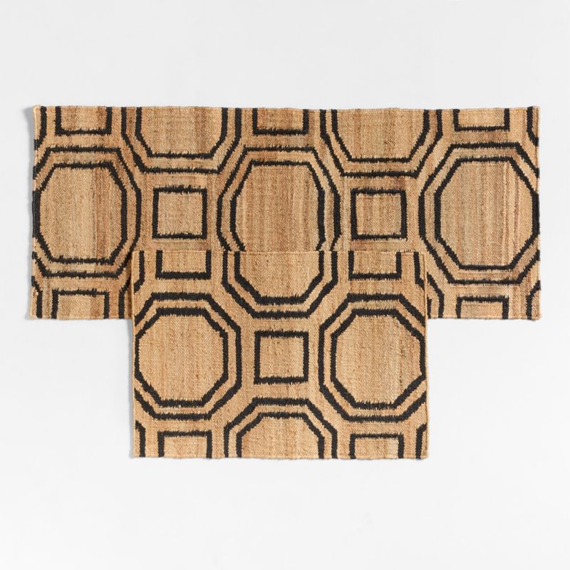 Inspired by tilework, our doormat recreates an elegant and organic coffered design in rugged jute. Black squares and concentric octagons stand out against the countless warm hues of the natural fiber. Handwoven by skilled artisans, the indoor/outdoor mat fits easily under most doors to adorn your porch, mudroom or entryway. We especially love the look of this doormat layered on a tile floor for a fascinating play of patterns.