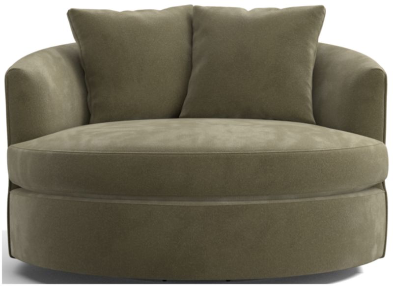Round out your living room with the contemporary curves of Tillie. With enough space for two, this roomy swivel chair beckons you to kick off your shoes and snuggle up in the round. The swivel base lets you follow the conversation or rotate for a new view. A tight barrel back completes the circle, while soft throw pillows nestle a comfy seat. The Tillie Grande Swivel Chair is a Crate and Barrel exclusive.