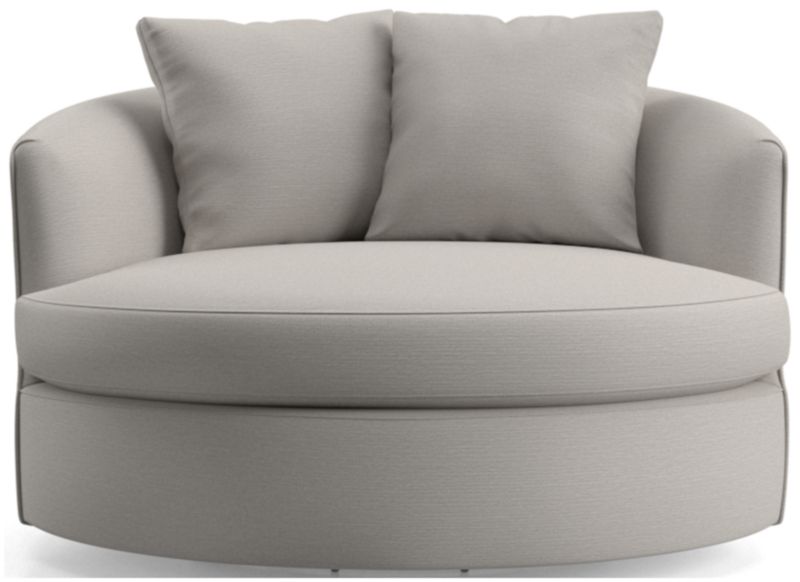Round out your living room with the contemporary curves of Tillie. With enough space for two, this roomy swivel chair beckons you to kick off your shoes and snuggle up in the round. The swivel base lets you follow the conversation or rotate for a new view. A tight barrel back completes the circle, while soft throw pillows nestle a comfy seat. The Tillie Grande Swivel Chair is a Crate and Barrel exclusive.