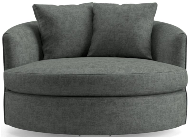 Round out your living room with the contemporary curves of Tillie. With enough space for two, this roomy swivel chair beckons you to kick off your shoes and snuggle up in the round. The swivel base lets you follow the conversation or rotate for a new view. A tight barrel back completes the circle, while soft throw pillows nestle a comfy seat. The Tillie Grande Swivel Chair is a Crate and Barrel exclusive.
