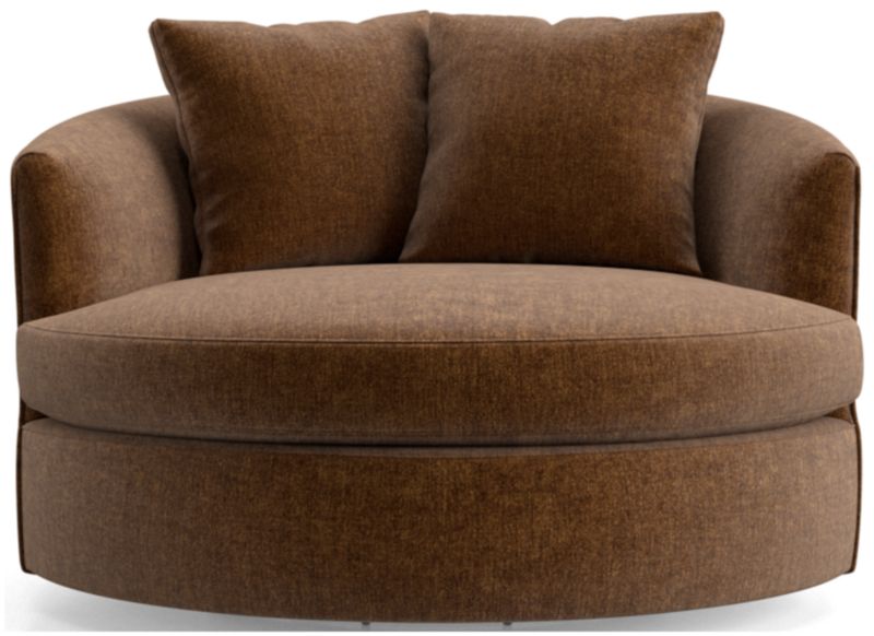 Round out your living room with the contemporary curves of Tillie. With enough space for two, this roomy swivel chair beckons you to kick off your shoes and snuggle up in the round. The swivel base lets you follow the conversation or rotate for a new view. A tight barrel back completes the circle, while soft throw pillows nestle a comfy seat. The Tillie Grande Swivel Chair is a Crate and Barrel exclusive.