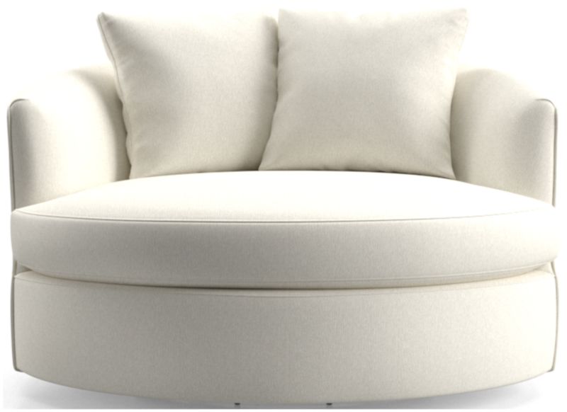 Round out your living room with the contemporary curves of Tillie. With enough space for two, this roomy swivel chair beckons you to kick off your shoes and snuggle up in the round. The swivel base lets you follow the conversation or rotate for a new view. A tight barrel back completes the circle, while soft throw pillows nestle a comfy seat. The Tillie Grande Swivel Chair is a Crate and Barrel exclusive.