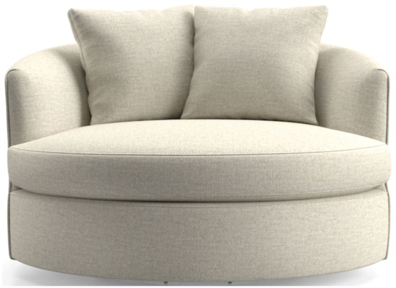 Round out your living room with the contemporary curves of Tillie. With enough space for two, this roomy swivel chair beckons you to kick off your shoes and snuggle up in the round. The swivel base lets you follow the conversation or rotate for a new view. A tight barrel back completes the circle, while soft throw pillows nestle a comfy seat. The Tillie Grande Swivel Chair is a Crate and Barrel exclusive.