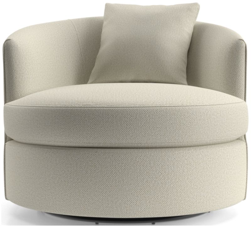 Round out your living room with the contemporary curves of Tillie. This inviting swivel chair beckons you to kick off your shoes and snuggle up in the round. The swivel base lets you follow the conversation or rotate for a new view. A tight barrel back completes the circle, while a soft throw pillow nestles a comfy seat. The Tillie Swivel Chair is a Crate and Barrel exclusive.