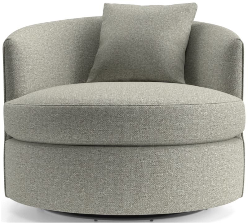 Round out your living room with the contemporary curves of Tillie. This inviting swivel chair beckons you to kick off your shoes and snuggle up in the round. The swivel base lets you follow the conversation or rotate for a new view. A tight barrel back completes the circle, while a soft throw pillow nestles a comfy seat. The Tillie Swivel Chair is a Crate and Barrel exclusive.