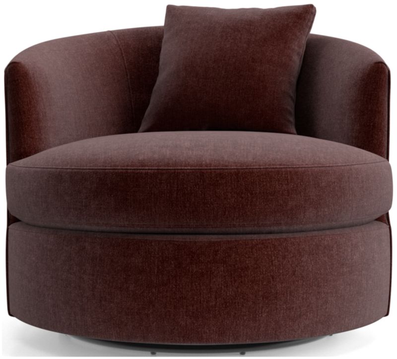 Round out your living room with the contemporary curves of Tillie. This inviting swivel chair beckons you to kick off your shoes and snuggle up in the round. The swivel base lets you follow the conversation or rotate for a new view. A tight barrel back completes the circle, while a soft throw pillow nestles a comfy seat. The Tillie Swivel Chair is a Crate and Barrel exclusive.