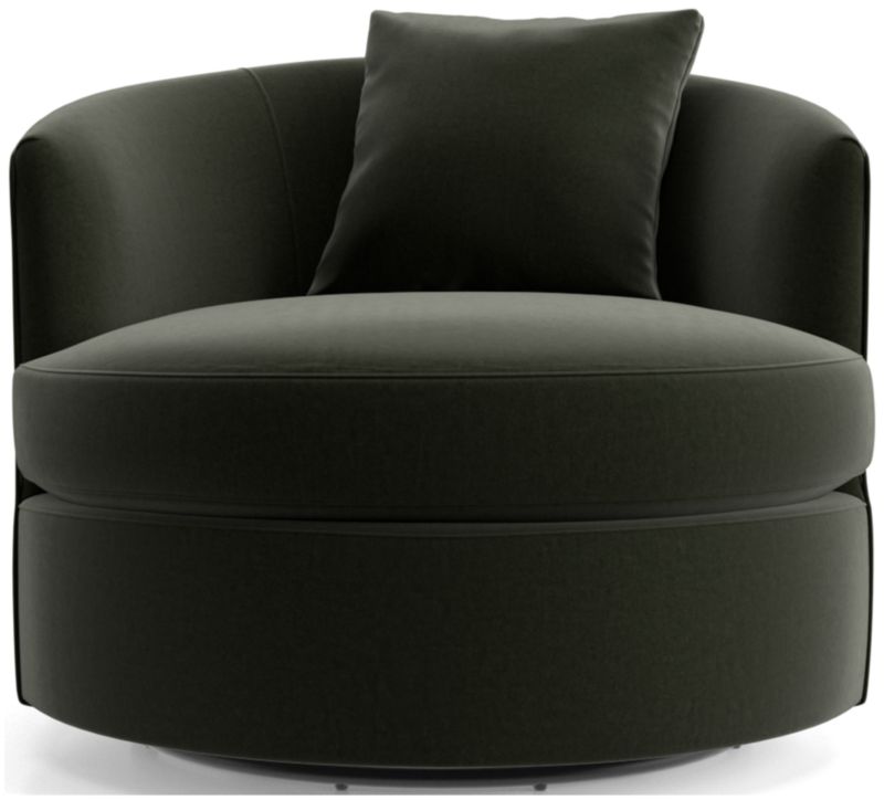 Round out your living room with the contemporary curves of Tillie. This inviting swivel chair beckons you to kick off your shoes and snuggle up in the round. The swivel base lets you follow the conversation or rotate for a new view. A tight barrel back completes the circle, while a soft throw pillow nestles a comfy seat. The Tillie Swivel Chair is a Crate and Barrel exclusive.