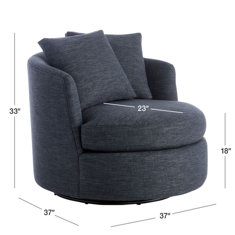 Round out your living room with the contemporary curves of Tillie. This inviting swivel chair beckons you to kick off your shoes and snuggle up in the round. The swivel base lets you follow the conversation or rotate for a new view. A tight barrel back completes the circle, while a soft throw pillow nestles a comfy seat. The Tillie Swivel Chair is a Crate and Barrel exclusive.