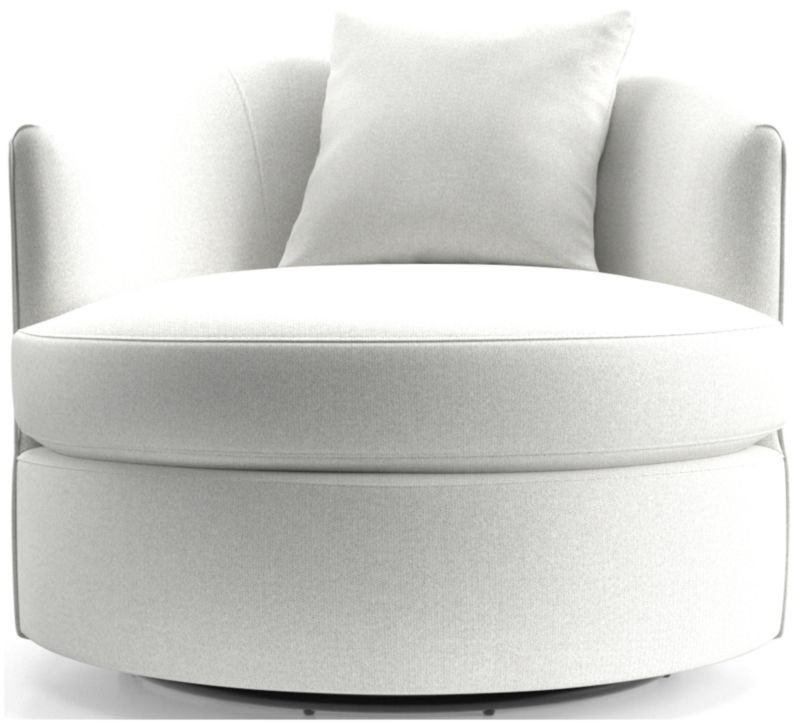 Round out your living room with the contemporary curves of Tillie. This inviting swivel chair beckons you to kick off your shoes and snuggle up in the round. The swivel base lets you follow the conversation or rotate for a new view. A tight barrel back completes the circle, while a soft throw pillow nestles a comfy seat. The Tillie Swivel Chair is a Crate and Barrel exclusive.