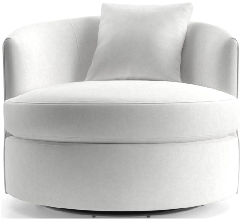 Round out your living room with the contemporary curves of Tillie. This inviting swivel chair beckons you to kick off your shoes and snuggle up in the round. The swivel base lets you follow the conversation or rotate for a new view. A tight barrel back completes the circle, while a soft throw pillow nestles a comfy seat. The Tillie Swivel Chair is a Crate and Barrel exclusive.