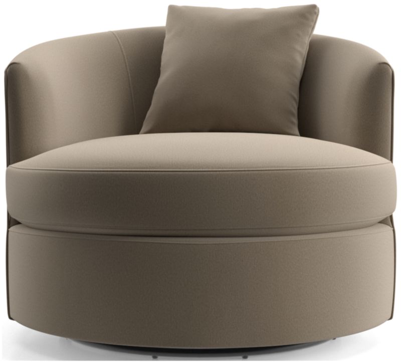 Round out your living room with the contemporary curves of Tillie. This inviting swivel chair beckons you to kick off your shoes and snuggle up in the round. The swivel base lets you follow the conversation or rotate for a new view. A tight barrel back completes the circle, while a soft throw pillow nestles a comfy seat. The Tillie Swivel Chair is a Crate and Barrel exclusive.