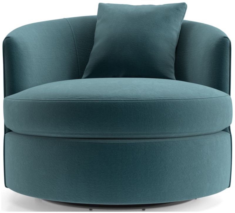 Round out your living room with the contemporary curves of Tillie. This inviting swivel chair beckons you to kick off your shoes and snuggle up in the round. The swivel base lets you follow the conversation or rotate for a new view. A tight barrel back completes the circle, while a soft throw pillow nestles a comfy seat. The Tillie Swivel Chair is a Crate and Barrel exclusive.