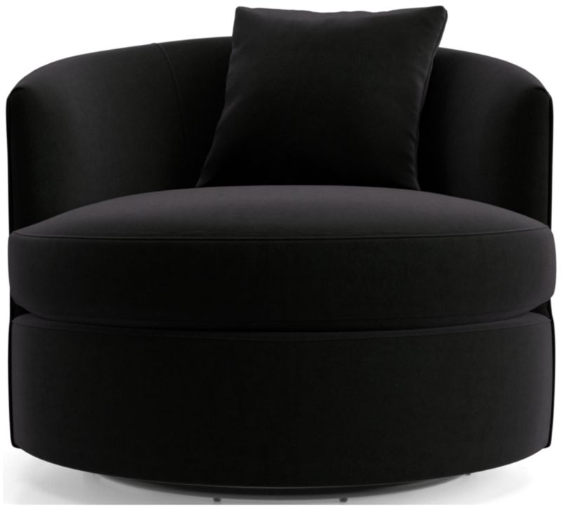 Round out your living room with the contemporary curves of Tillie. This inviting swivel chair beckons you to kick off your shoes and snuggle up in the round. The swivel base lets you follow the conversation or rotate for a new view. A tight barrel back completes the circle, while a soft throw pillow nestles a comfy seat. The Tillie Swivel Chair is a Crate and Barrel exclusive.