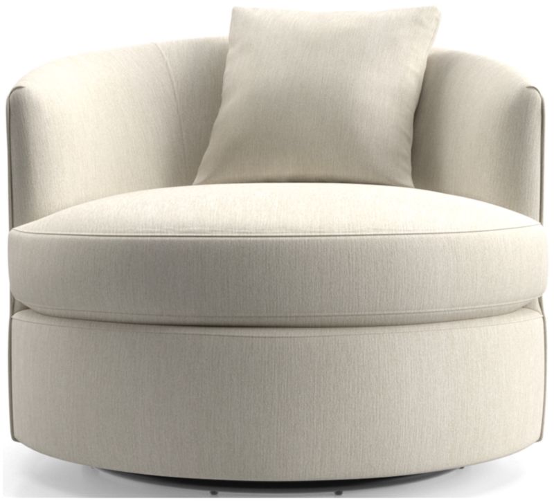 Round out your living room with the contemporary curves of Tillie. This inviting swivel chair beckons you to kick off your shoes and snuggle up in the round. The swivel base lets you follow the conversation or rotate for a new view. A tight barrel back completes the circle, while a soft throw pillow nestles a comfy seat. The Tillie Swivel Chair is a Crate and Barrel exclusive.
