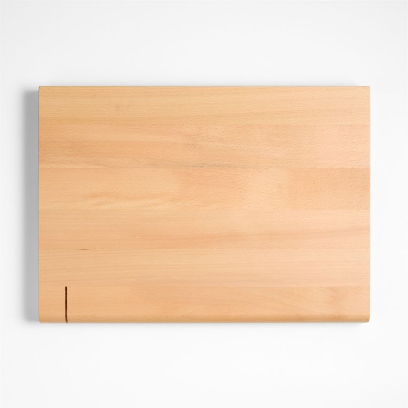 Daniel Humm designed this cutting board with quiet-but intentional details to elevate everyday prepping and serving. A sliver of black walnut inlaid into one corner adds a hint of color contrast and artisanal joinery to the beautifully grained beechwood board. Half-bullnose edging on two sides softens the profile, while integrated finger holds make it easy to carry the board from counter to stove or to pass cheeses and appetizers.