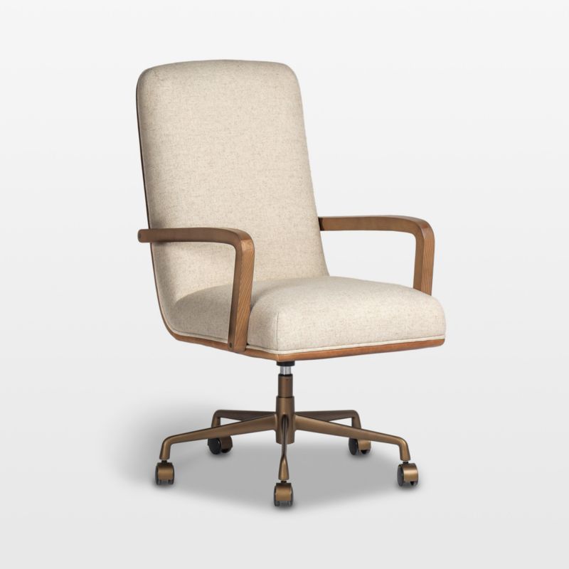Timeo brings boardroom style and mixed-material panache to the home office. The classic silhouette features a seamless cushioned flow, upholstered in an off-white, linen-blend performance fabric. Solid ash curves streamlined armrests, finished in amber to match the saddle brown top-grain leather that tailors the back. The aluminum base finished in brushed brass features caster wheels for easy movement from desk to work table to file cabinet.