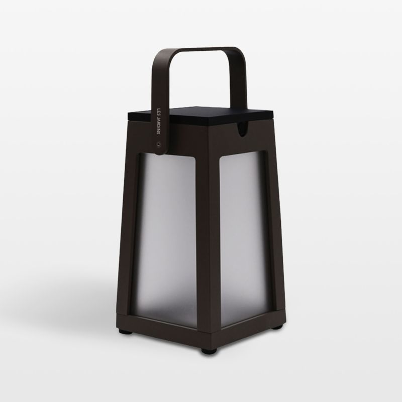 Makers of high-efficiency solar lighting, Les Jardins illuminates outdoor spaces with lanterns that deliver long-lasting light along with high style. A dark grey finish accentuates the Tinka lantern's clean lines and streamlined silhouette. Inset with frosted glass panels for an ambient glow, the lantern charms with its petite size charmer and wide, pivoting handle. We love this portable lantern in multiples, lining a walkway, creating garden intrigue or illuminating outdoor entertaining.