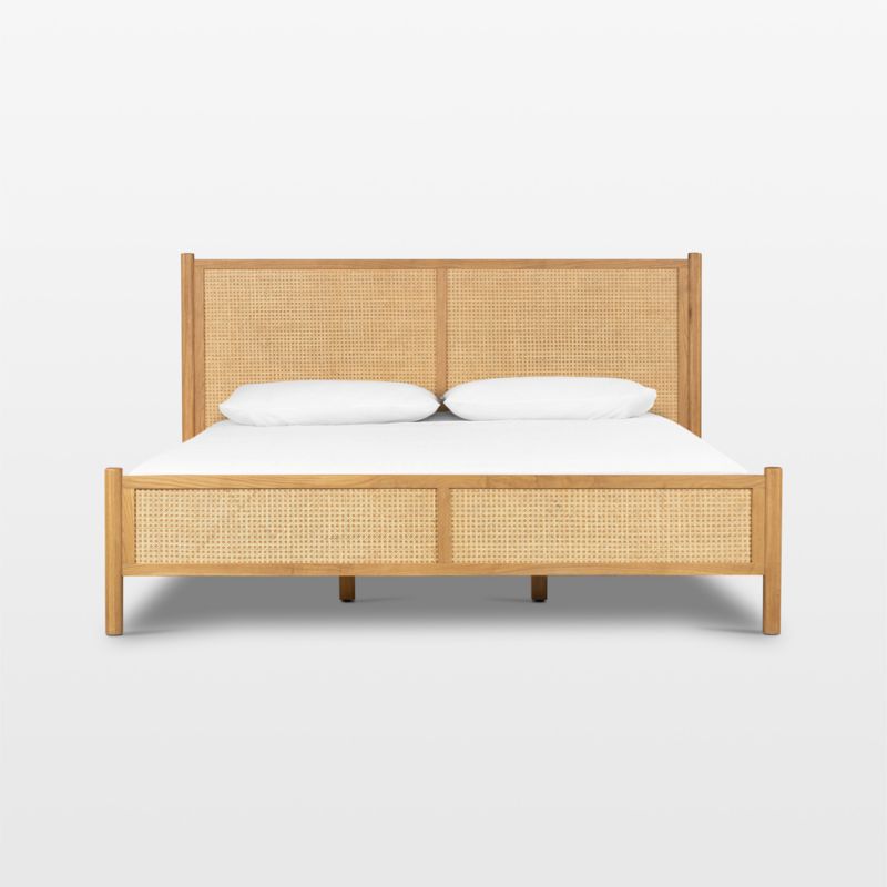 On-trend cane lends a coastal feel to our oak Tisdell bed. Warmed by a khaki-toned finish, the solid oak bed frames panels of woven cane on the footboard and tall headboard. Solid wood rails and substantial dowel legs anchor the bed with clean lines. For a coordinated bedroom, pair with the Tisdell six- or nine-drawer dressers.