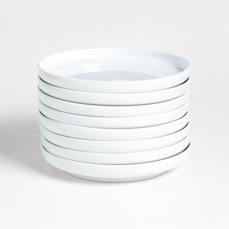 Crisp white porcelain dinnerware trends modern and flexible in modern, rounded coupe shapes perfectly at ease in casual and formal settings. Low curves allow for easy stacking and space-saving storage.