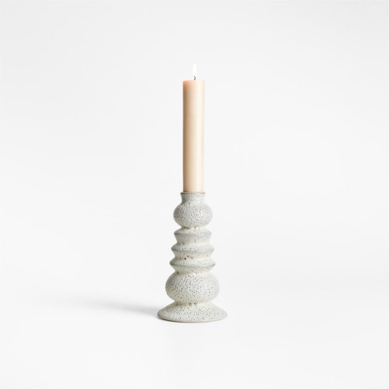 A bubbled glaze finishes this candle holder with fascinating texture. Designed by Laura Kim, the small, sculptural candle holder has major presence on the table (especially paired with its larger counterpart). We love the way the light grey volcanic glaze gives the stacked volumes an ancient, artisanal feel. Each modern organic taper candle holder is striking and unique.