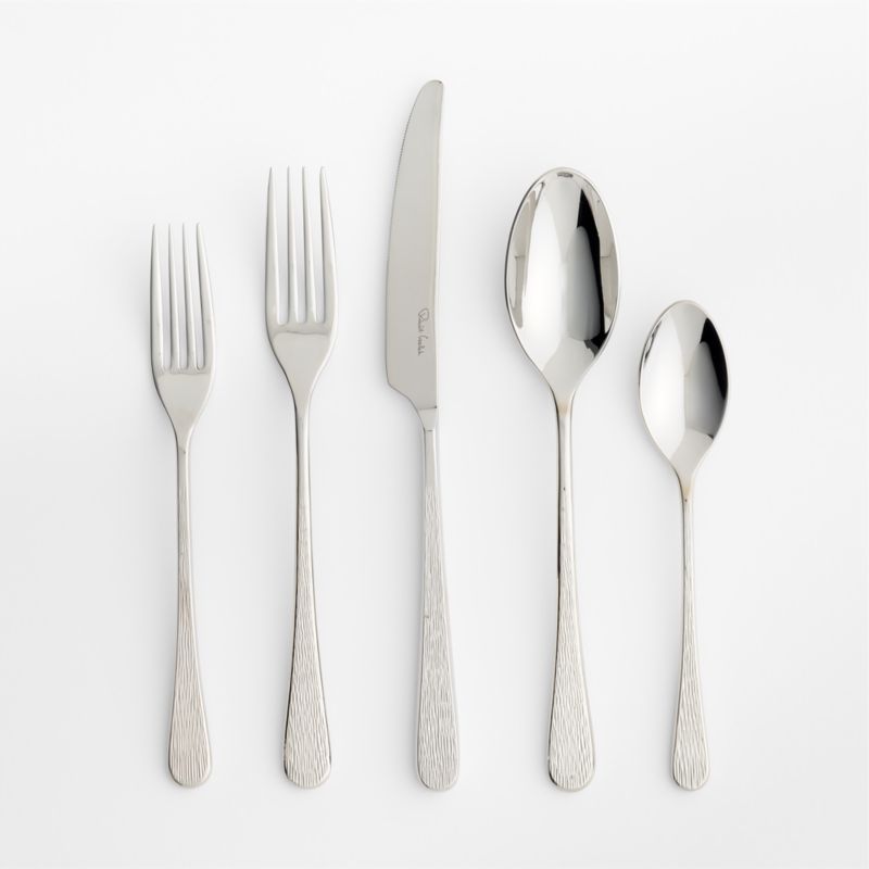 Fashionably svelte and highly polished. The slender, flowing shapes of our Tour flatware are stamped and forged in stainless steel and subtly scored with delicate lines. The resulting texture brings organic beauty to the table. This five-piece place setting includes a salad fork, dinner fork, dinner knife, dinner spoon and teaspoon. Designed by Robert Welch exclusively for Crate and Barrel, this set mixes perfectly with our Tour serving pieces in mirror and satin finishes.