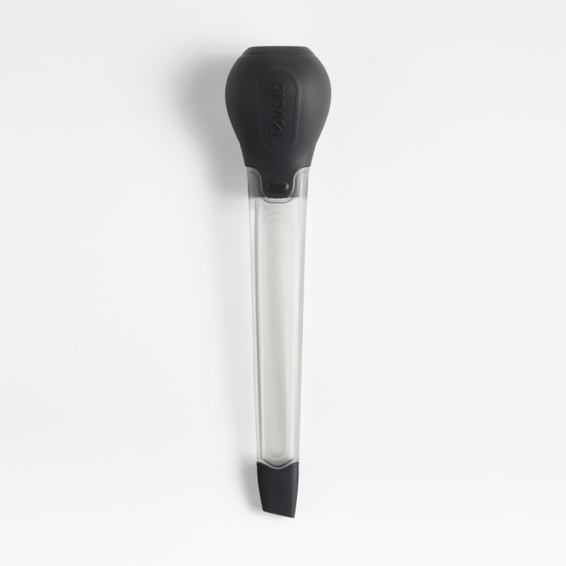 Moisten, flavor and marinade without the mess with this easy-to-use baster. The clever non-drip valve and angled tip ensure marinades, sauces and oils coat roasting meats—not your oven. The large bulb draws up and holds a generous amount of liquid for basting, then flattens for compact storage in the drawer between uses. An essential tool for summer grilling as well as holiday feasts, the sturdy plastic bulb baster cleans up easily in the dishwasher.