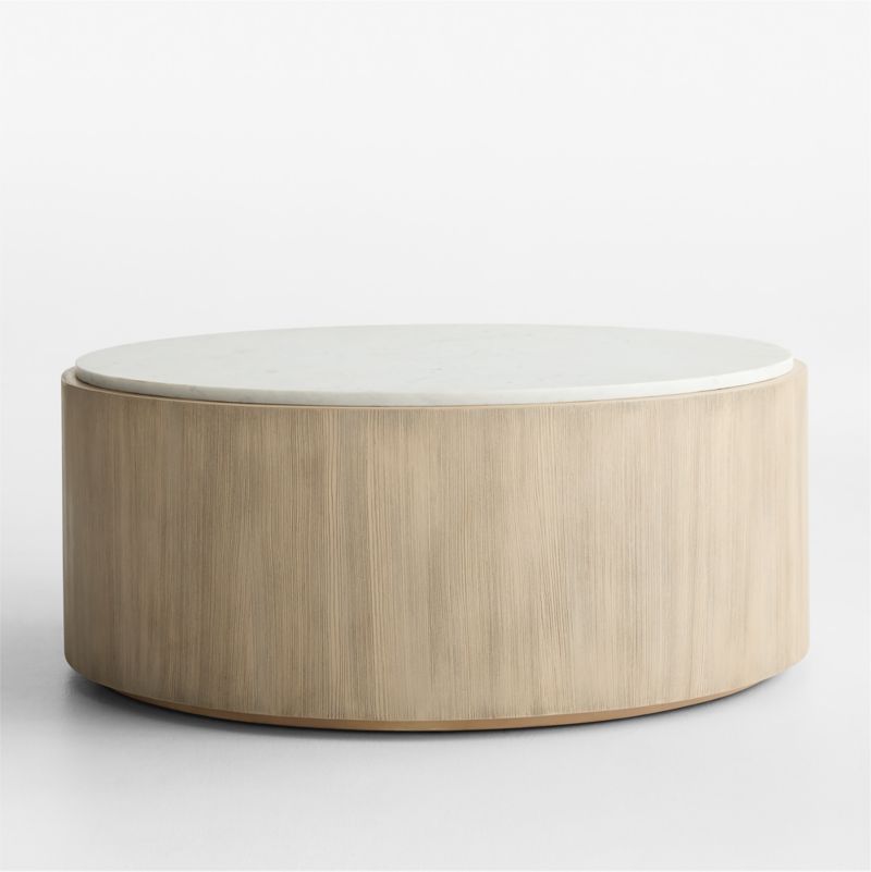 Troupe's deceptively simple circular design offers more than meets the eye. A continuous birds-beak joint traces the coffee table's perimeter, bringing dimension to its drum-like contours. Composed of quarter-sawn planks of pine veneer, the round table showcases dynamic graining that's enhanced with wirebrushing and a glazed finish. A top of honed white Banswara marble pairs naturally with the wood's light, warm color, and a recessed plinth base lets our exclusive coffee table float in a room.
