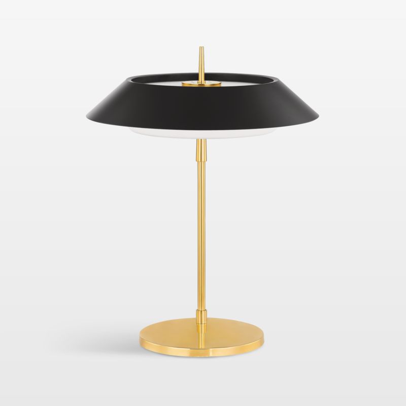 Truro takes design clues from Art Deco and midcentury modern design to create this stunning table lamp. A two-tone shade layers a tapered black ring over an enclosed form of matte opal glass. Adding golden counterpoint, the slim stem rising from a round base looks as if it pierces through the shade ending in slim finial on a perforated plate.