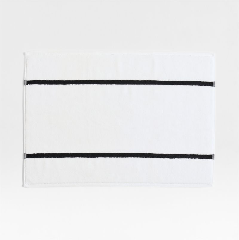 Our tuxedo towel collection dresses up your bathroom for a chic and put-together look. Inspired by timeless formal wear, two black embroidered stripes detail this organic cotton bath mat. Inky embroidery contrasts with the bright white, densely looped terrycloth for an indulgent mat that looks sophisticated and feels irresistibly soft and absorbent. Pair with the coordinating towels for an impeccably tailored and always-in-style bathroom.