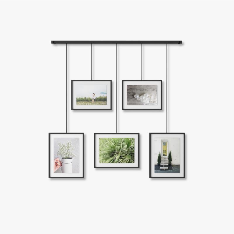 If you've always wanted a gallery wall but hesitated from putting numerous holes in your wall, the Umbra system has the solution. The wall-hanging system suspends five frames from a single ledge that mounts on the wall. Five bracketed frames—two 4"x6" and three 5"x7"—can be positioned along the bar and rotated to landscape or portrait orientations. Hanging rods can also be interchanged to further customize your layout. The ledge can also be hung at an angle, making it a great way to dress up stairwell walls. Finished in black, the hanging picture frames allow you to easily switch out photographs and artwork for changing displays and an instant room refresh.