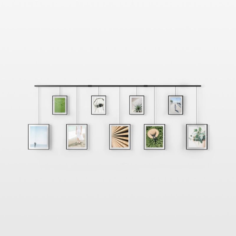 Create—and easily update—an effortless gallery wall using this clever frame set. Requiring only four holes be made in a wall, the display includes nine frames suspended by hanging rods from a ledge, all crafted of black-finished steel for a sleek, modern look. The frames can be hung vertically or horizontally, and the hanging rods swapped for a completely customizable look. Suitable for diagonal installation in a stairway, our exclusive gallery wall frame set also hangs horizontally over a sofa, down a hallway or above a bed.