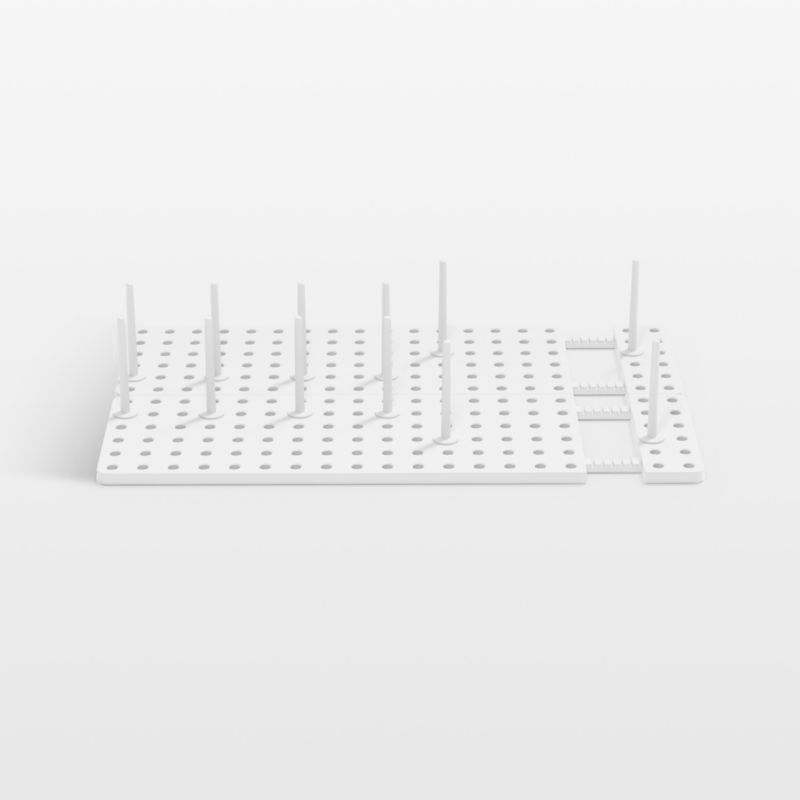 Peggy organizer offers flexible, fully adjustable storage for cookware and more in kitchen drawers. Pop the 16 pegs into any of the 108 holes to create the ideal configuration for pots, pans, lids, plastic storage containers and other hard-to-keep-neat essentials. Expanding by an extra three inches, the bright white drawer organizer also works in cabinets and on shelves to offer adjustable storage wherever you need it.